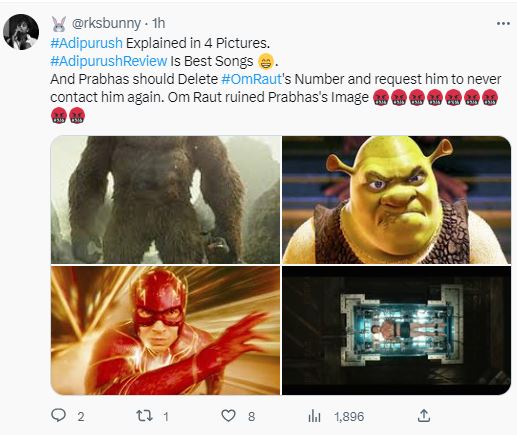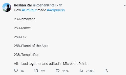 अन्य यूजर ने लिखा, "ओम राउत ने 'आदिपुरुष' में 2 परसेंट रामायण, 25 परसेंट मार्वल, 25 परसेंट डीसी कॉमिक, 25 परसेंट प्लानेट ऑफ द एप्स, 23 परसेंट टेम्पल रन। सभी चीजों को एक साथ माइक्रोसॉफ्ट पेंट कर दिया है"।