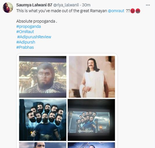 आदिपुरुष मूवी में रामायण का मजाक ही उड़ा दिया है। आदिपुरुष को बायकॉट करो"। दूसरे यूजर ने अपना गुस्सा व्यक्त करते हुए लिखा, "आपने ग्रेट रामायण से ये बनाया है ओम राउत"।