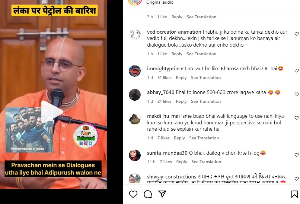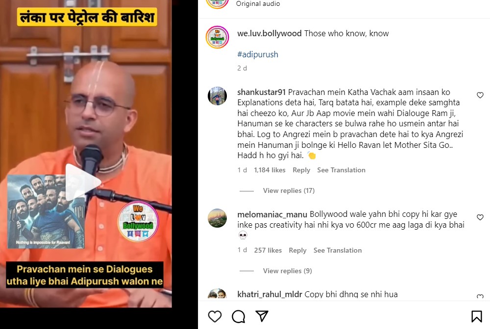 आदिपुरुष पर नेटिजन्स ने आरोप लगाया है कि फिल्म के डायलॉग्स इस्कॉन प्रवाचन से कॉपी किए गए है। सोशल मीडिया पर एक वीडियो वायरल हो रहा है, जो श्रीमान अमोघ लीला प्रभु का है। वीडियो उनके प्रवचन का है, जहां वो रावण और लंका के बारे में बात कर रहे हैं और लंका दहन के सीन का जिक्र कर रहे हैं।