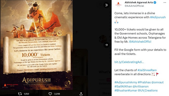 "आदिपुरुष के सिनेमैटिक अनुभव में डूब जाइए। 10,000 से ज्यादा टिकटें सरकारी स्कूल के बच्चों, अनाथालय और वृद्ध आश्रम के लोगों को तेलंगाना में अभिषेक अग्रवाल द्वारा निशुल्क दी जाएंगी। आपको टिकट पाने के लिए यह गूगल फॉर्म भरना होगा। आइए मिलकर जय श्री राम का नारा हर दिशा में गुंजायमान करें।"