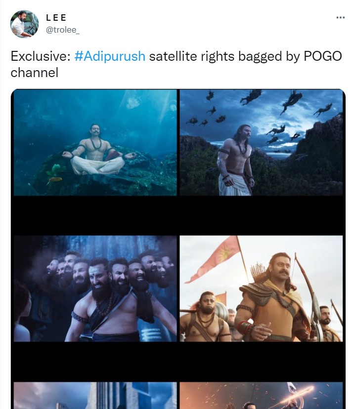 फिल्म के वीएफएक्स की आलोचना करते हुए कई लोगों ने कहा कि सिर्फ राजामौली जैसे डायरेक्टर ही श्रीराम के किरदार के साथ इंसाफ कर सकते हैं। बाकी, तो सिर्फ पैसे कमाने के लिए उनके ना का इस्तेमाल कर रहे हैं। एक यूजर कहा कि आदिपुरुष के सैटेलाइट राइट्स पोगो चैनल ने खरीद लिए हैं।
