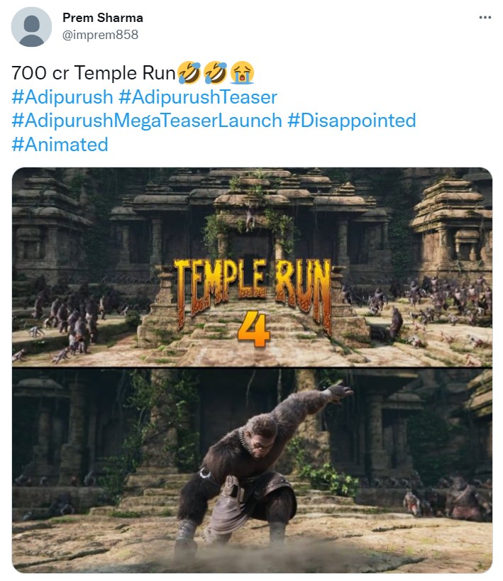 आदिपुरूष के टीजर से कुछ सीन को शेयर करते हुए ट्रोलर्स ने इसकी तुलना पॉपुलर गेम टेम्पल रन से कर दी। इसके साथ फिल्म के डायरेक्टर ओम राउत को आड़े हाथों लेते हुए कहा कि आप ने 500 करोड़ के बजट में आदिपुरुष के रूप में टेम्पल रन गेम बनाया है। वहीं, एक यूजर ने कहा कि आदिपुरुष के वीएफएक्स बच्चों की फिल्म ओह माय गॉड गणेशा के आर्टिस्ट से बनवाई गई है।