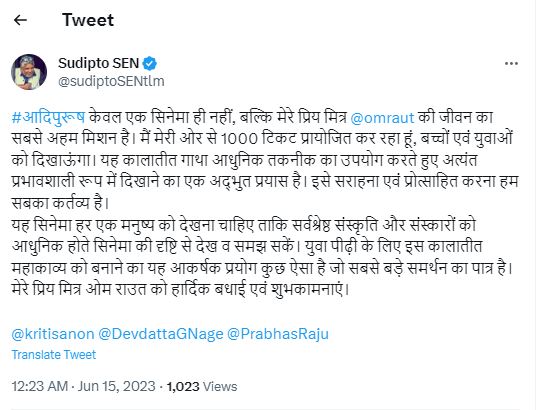 द केरल स्टोरी के निर्देशक सुदीप्तो सेन ने अपने इंस्टाग्राम अकाउंट पर ये जानकारी शेयर की कि उन्होंने ओम राउत की मोस्ट अवेटेड माइथोलॉजिकल फिल्म 'आदिपुरुष' की टिकट को स्पॉन्सर किया है। डायरेक्टर सुदीप्तो सेन ने ट्वीट करते हुए लिखा, "आदिपुरुष केवल एक सिनेमा ही नहीं, बल्कि मेरे प्रिय मित्र ओम राउत के जीवन का सबसे अहम मिशन है।