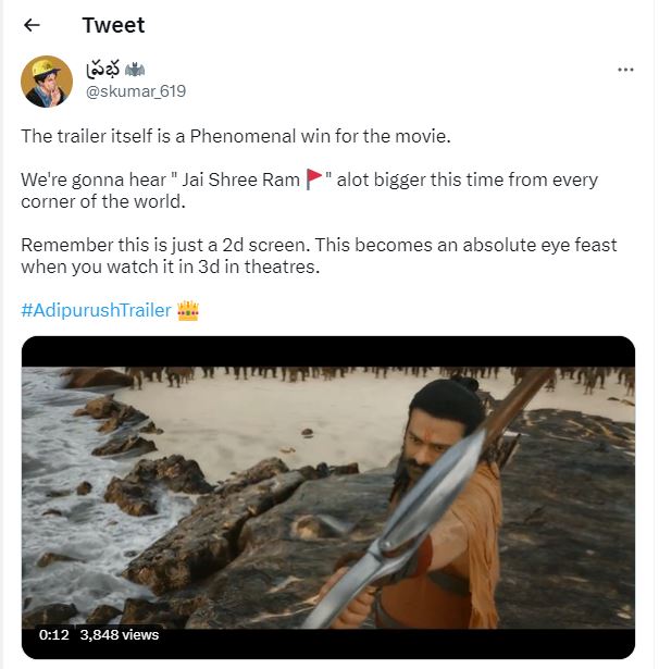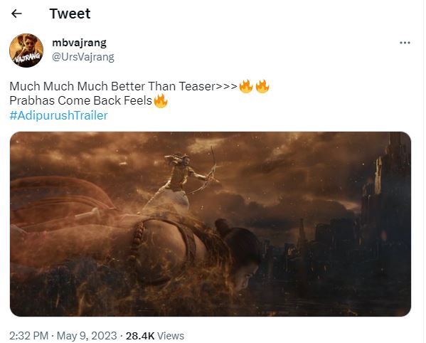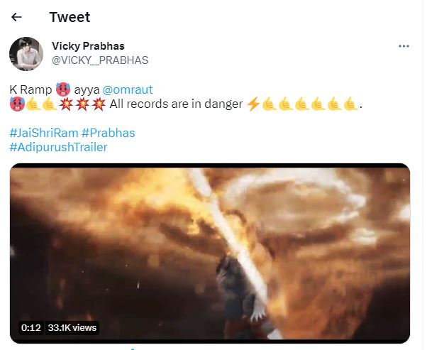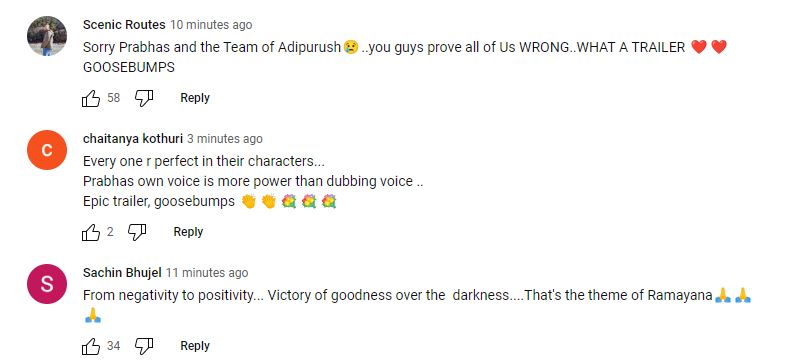 एक अन्य यूजर ने लिखा, 'आदिपुरुष की टीम और प्रभास हमें माफ करना, आपने हमें गलत साबित कर दिया। ये रोंगटे खड़े कर देने वाला ट्रेलर है'। एक और अन्य फैन ने लिखा, 'नकारात्मकता से लेकर, सकारात्मकता तक का सफर, अंधेरे ने अच्छाई पर सफलता हासिल की।