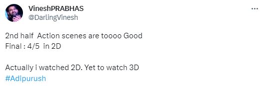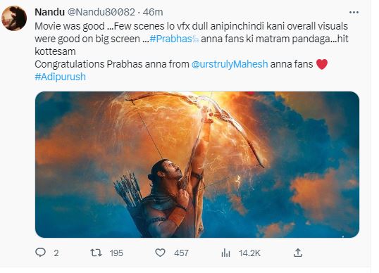 दूसरे यूजर ने लिखा, "मूवी अच्छी थी, कुछ विजुअल्स थोड़े डल थे, लेकिन ओवरऑल VFX बिग स्क्रीन पर अच्छे लग रहे थे। प्रभास अन्ना आपको फिल्म के लिए बहुत-बहुत मुबारकबाद"।