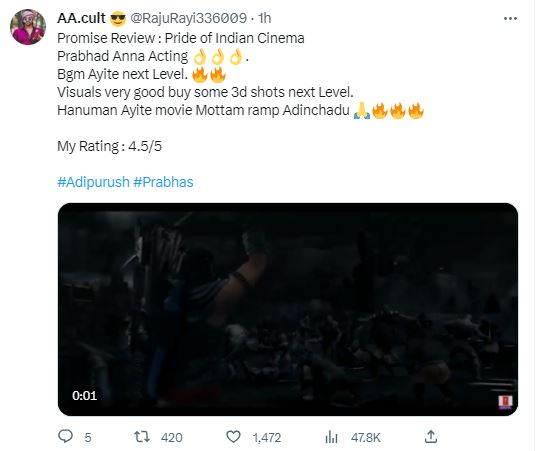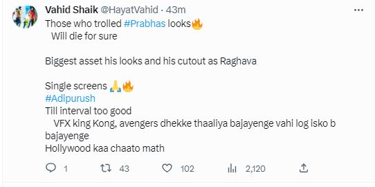 एक अन्य यूजर ने 'आदिपुरुष' देखने के बाद प्रभास के लुक की तारीफ की और लिखा, "जिन लोगों ने प्रभास को श्रीराम के लुक्स को लेकर ट्रोल किया था, वह अंदर से जल रहे होंगे। फिल्म में उनका जो सबसे बड़ा एसर्ट है वह राघव के रूप में उनके लुक और कटआउट हैं। इंटरवल तक ये फिल्म बहुत ही अच्छी है। VFX बहुत ही जबरदस्त है, एवेंजर्स देखकर तालियां बजाने वाले लोग इस फिल्म को देखकर भी तालियां बजाएंगे"।