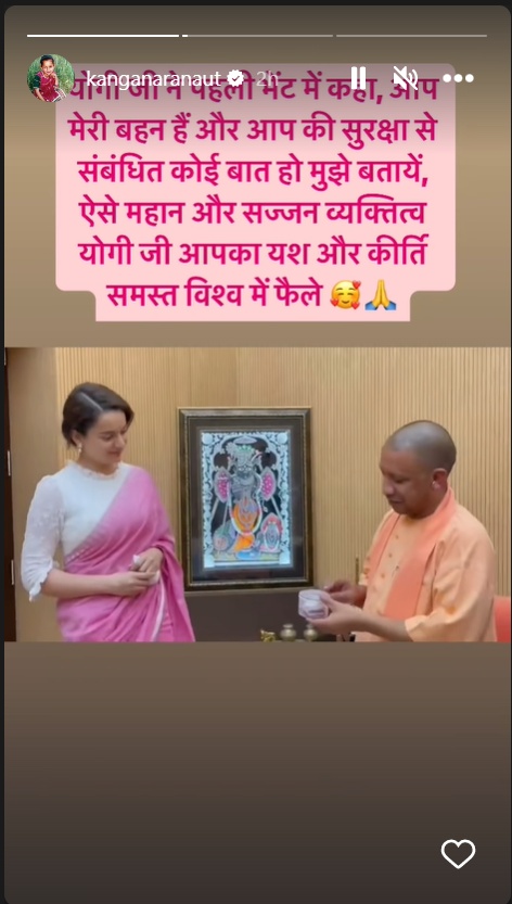 तो वहीं दूसरी स्टोरी में कंगना ने अपनी और सीएम योगी के साथ मुलाकात की तस्वीर शेयर की है। उन्होंने कैप्शन में लिखा- योगी जी ने पहली भेंट में कहा कि आप मेरी बहन हैं, आपकी सुरक्षा की जिम्मेदारी मेरी है। आपको कोई भी परेशानी हो तो मुझे बताएं। ऐसे महान और सज्जन व्यक्ति योगी, आपका यश और कीर्ति पूरे विश्व में फैले।
