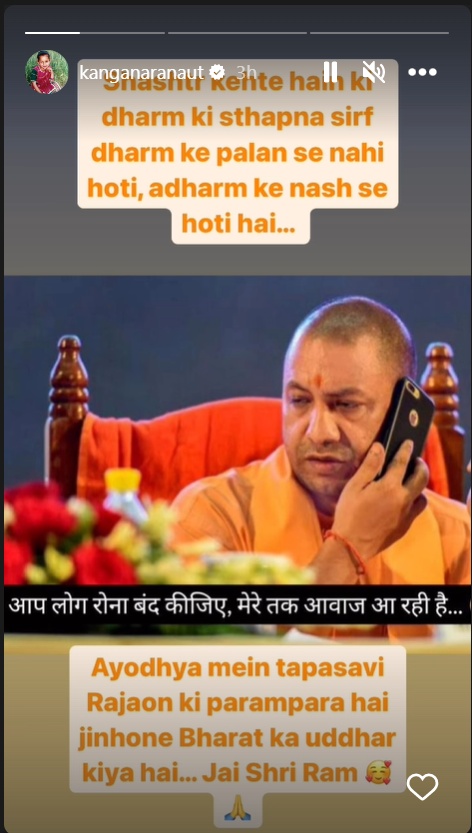कंगना रनोट ने अपनी इंस्टा स्टोरी में सीएम योगी की तस्वीर शेयर करके लिखा- "शास्त्र कहते हैं कि धर्म की स्थापना सिर्फ धर्म के पालन से नहीं होती, बल्कि अधर्म के नाश से भी होती है।" तस्वीर में योगी जी फोन पर किसी से बात करते नजर आ रहे हैं। इसके साथ कंगना ने लिखा- "आप लोग रोना बंद कीजिए, मेरे तक आवाज आ रही है" अयोध्या में तपस्वी राजाओं की परंपरा है जिन्होंने भारत का उद्धार किया है... जय श्री राम