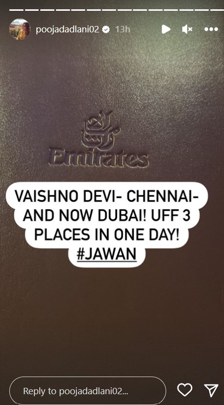 पूजा ददलानी ने इंस्टाग्राम पर फोटो शेयर की, जिसमें उन्होंने एयरलाइन की फोटो पोस्ट की। इसके साथ लिखा, ''वैष्णो देवी-चेन्नई के बाद अब दुबई की बारी। एक ही दिन में तीन जगह। #Jawan''