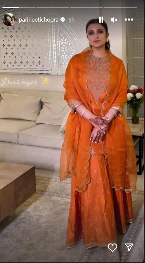 परिणीति ने अपनी दिवाली की तैयारी बेहद सिंपल और एलिगेंट अंदाज में की। एक्ट्रेस ने ऑरेंज सूट में इंस्टाग्राम स्टोरी पर अपनी कुछ तस्वीरें शेयर कीं। इस दौरान एक्ट्रेस काजल, बड़ी-बड़ी ईयररिंग और हाथों में मेहंदी लगाए नजर आईं। अपने लुक को कम्प्लीट करने के लिए उन्होंने लाइट मेकअप किया। परिणीति इस अंदाज में बला की खूबसूरत लग रही थीं।
