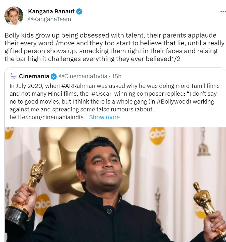 एआर रहमान के इस ट्वीट पर कंगना रनोट ने भी रिएक्ट किया। एक्ट्रेस ने कहा, "बॉलीवुड किड्स खुद को टैलेंटेड समझते हुए बड़े होते हैं, उनके माता-पिता उनकी हर एक हरकत/ हर एक बात पर तारीफ करते हैं और वो भी इस झूठ पर यकीन करना शुरू कर देते हैं, जब तक कि सही मायने में एक टैलेंटेड एक्टर उनके सामने नहीं आ जाता, उनके मुंह पर तमाचा नहीं मार देता और स्टैंडर्ड को बढ़ा देता, जो उनकी हर उस बात को चुनौती देता है, जिस पर वो यकीन करते आए थे।"