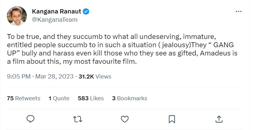तनु वेड्स मनु एक्ट्रेस ने कहा, "सच है, और वे सभी अयोग्य, अपरिपक्व, हकदार लोगों के आगे झुक जाते हैं, ऐसी स्थिति (ईर्ष्या) में वे "गैंग अप" हो जाते हैं, धमकाते हैं और परेशान करते हैं, यहां तक कि ये लोग उन्हें मार डालते हैं जिन्हें वे काबिल देखते हैं, एमेडियस इस बारे में एक फिल्म है, मेरी सबसे पसंदीदा फिल्म है ये।"
