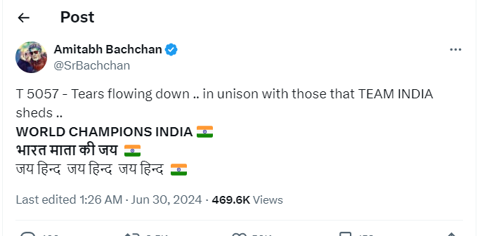भारतीय जनता की इस जीत का कोई ठीकाना नहीं है। भारत में शनिवार को दिवाली के त्योहार की तरह जश्न मनाया गया। अमिताभ बच्चन ने रविवार रात 30 जून को सोशल मीडिया एक्स पर एक नया पोस्ट साझा किया है, जिसमें उन्होंने लिखा- आंसू बह रहे हैं। उन आंसुओं के साथ जो टीम इंडिया ने उस दौरान बहाए जब सब जीत का जश्न मना रहे हैं। वर्ल्ड चैंपियन इंडिया…, भारत माता की जय… जय हिन्द जय हिन्द जय हिन्द।
