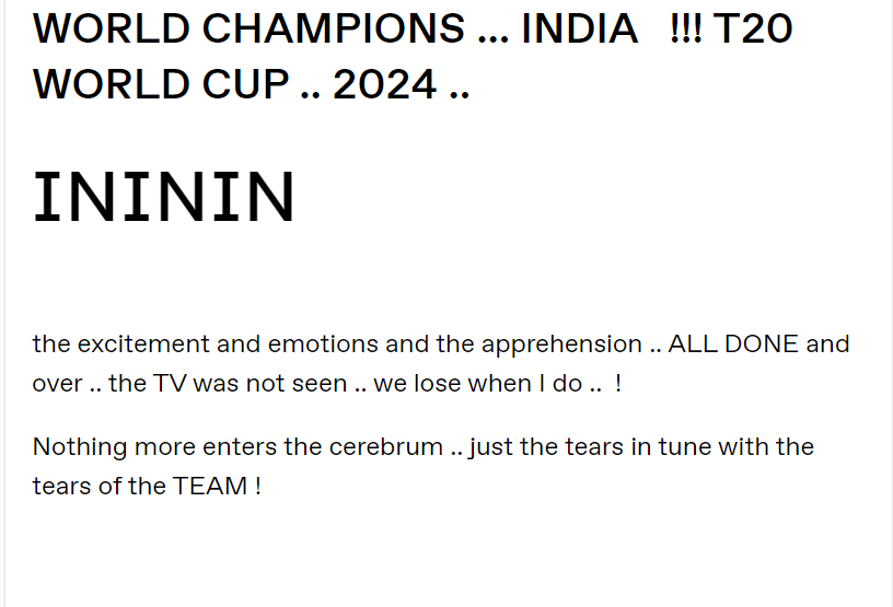 इसके अलावा अमिताभ बच्चन ने अपने ब्लॉग में लिखा- एक्साइटमेंट…इमोशंस सब हो गया, लेकिन मैंने टीवी नहीं देखा, क्योंकि जब मैं देखता हूं तो हम हार जाते हैं।