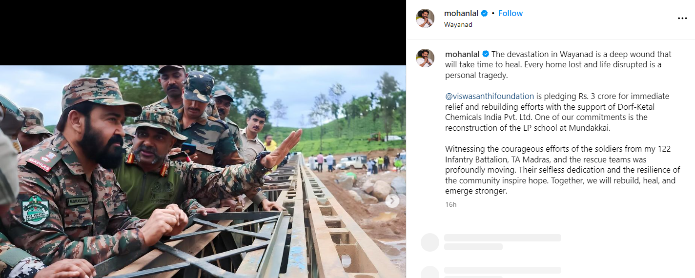 जाने-माने अभिनेता मोहनलाल, जो भारतीय प्रादेशिक सेना में लेफ्टिनेंट कर्नल भी हैं। शनिवार को अपनी सेना की वर्दी पहनकर भूस्खलन प्रभावित वायनाड पहुंचे और आपदा प्रभावित क्षेत्र के पुनर्वास कार्यों के लिए ₹3 करोड़ देने का वादा किया। मेप्पादी स्थित सैन्य शिविर पहुंचे अभिनेता ने अधिकारियों के साथ संक्षिप्त चर्चा की और अन्य लोगों के साथ भूस्खलन प्रभावित क्षेत्र के लिए रवाना हो गए।