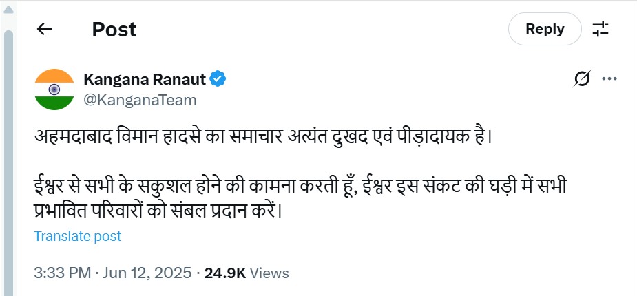 कंगना रनौत ने लिखा, 'अहमदाबाद विमान हादसे का समाचार अत्यंत दुखद एवं पीड़ादायक है। ईश्वर से सभी के सकुशल होने की कामना करती हूं। ईश्वर इस संकट की घड़ी में सभी प्रभावित परिवारों को संबल प्रदान करें।'