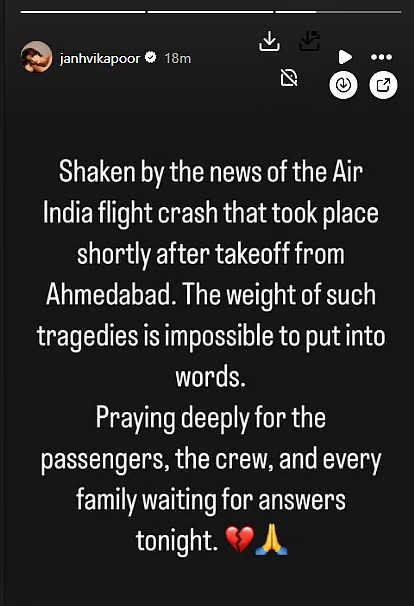 जाह्नवी कपूर ने इंस्टाग्राम स्टोरी पर लिखा, "अहमदाबाद से उड़ान भरने के तुरंत बाद एयर इंडिया की फ्लाइट क्रैश होने की खबर सुनकर स्तब्ध हूं। ऐसी त्रासदियों का भार शब्दों में बयां करना असंभव है। यात्रियों, क्रू मेंबर्स और आज रात जवाब का इंतजार कर रहे हर परिवार के लिए गहराई से प्रार्थना कर रही हूं।"