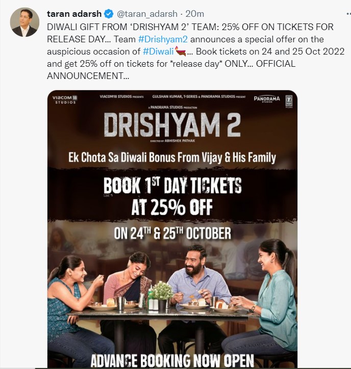 तरण आदर्श के शेयर किए गए ट्वीट के मुताबिक, दिवाली के मौके पर दृश्यम 2 की टिकट बुकिंग करने पर 25% की छूट मिलेगी। उन्होंने लिखा, 'टीम #Drishyam2 ने दिवाली के मौके पर स्पेशल ऑफर अनाउंस किया है। 24 और 25 अक्टूबर को टिकट बुकिंग करने पर 25 प्रतिशत की छूट मिलेगी। यह ऑफिशल अनाउंसमेंट है।' एडवांस बुकिंग करने वालों के लिए खास मौका हो सकता है।