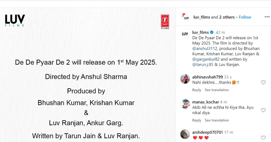 शैतान की कामयाबी के बीच अजय देवगन की अपकमिंग फिल्म को लेकर बड़ा अपडेट सामने आ गया है। हिंदी सिनेमा के मशहूर फिल्ममेकर्स लव रंजन ने अपनी नई फिल्म का ऐलान कर दिया है। उन्होंने ऑफिशियल इंस्टाग्राम हैंडल पर जानकारी देते हुए बताया है- दे दे प्यार दे का पार्ट 2 बनने वाला है जोकि अगले साल 1 मई 2025 को बड़े पर्दे पर रिलीज किया जाएगा।