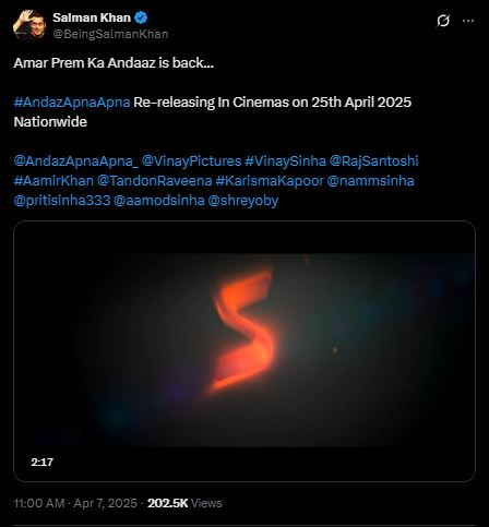 पोस्ट में सलमान ने लिखा, "अमर प्रेम का अंदाज वापस आ गया है। 30 साल बाद एक बार फिर अमर और प्रेम की जोड़ी दर्शकों का दिल जीतने आ रही है। अंदाज अपना अपना 25 अप्रैल 2025 को पूरे भारत में सिनेमाघरों में फिर से रिलीज की जाएगी।”