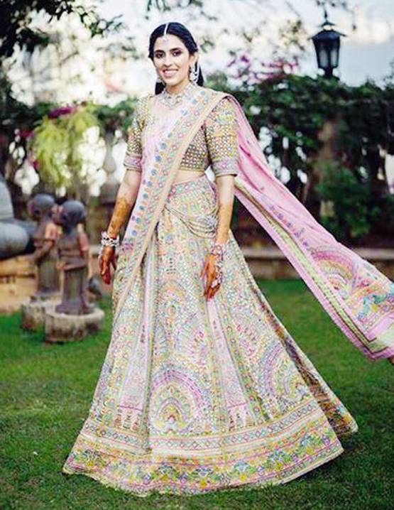 श्लोक ने अपनी शादी में ज्यादातर अबू जानी संदीप खोसला के ही आउटफिट्स पहने हैं। पिंक बेस पर मल्टी कलर का यह खूबसूरत डिजाईन श्लोका पर बहुत ही सुन्दर लग रहा है। एल्बो-लेंथ का ब्लाउज़ और परफेक्ट प्लेटेड लॉन्ग दुपट्टा को श्लोका ने मिडल पार्टेड हेयरस्टाइल के साथ कैरी किया।