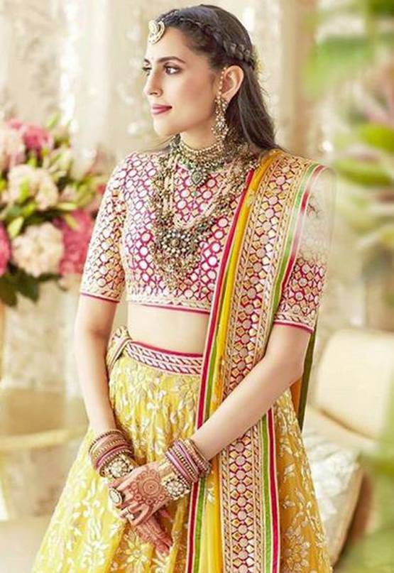 मेंहदी सेरेमनी के लिए श्लोका ने चुना अबू जानी संदीप खोसला का यह ब्राइट येलो एम्ब्रोइडेड गोटा वर्क का लहंगा जिसे डिज़ाइनर ने पिंक फुल नैक के टॉप के साथ स्टाइल किया है। टू-पीस न नैकलेस, मैचिंग इअरिंग्स, मांगटिका और ब्रेडेड हेयरस्टाइल भी श्लोका पर बहुत अच्छी लग रही थीं।