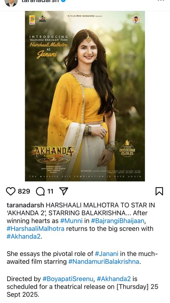 सलमान खान की बजरंगी भाईजान में जिस तरह से हर्षाली मल्होत्रा ने अपनी क्यूटनेस हर किसी का दिल जीता, उससे ये अनुमान लग गया कि आने वाले समय में वह सिनेमा जगत का बड़ा चेहरा बनेंगी। बॉलीवुड के बाद अब हर्षाली को साउथ सिनेमा में अपना हुनर दिखाने का मौका मिला है। दरअसल आने वाले समय में वह साउथ सिनेमा के दिग्गज अभिनेता नंदमुरि बालाकृष्ण की मोस्ट अवेटेड मूवी अखंडा 2 (Akhanda 2) में दिखाई देंगे।