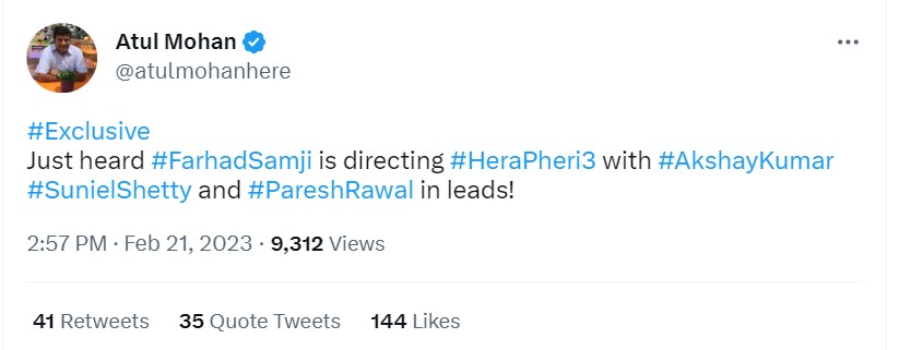 ट्विटर पर हेरा फेरी 3 को लेकर कुछ खबरें सामने आ रही हैं, जो फिल्म में अक्षय कुमार की वापसी की जानकारी दे रही हैं। हेरा फेरी में अब तक परेश रावल, सुनील शेट्टी और अक्षय कुमार की जबरदस्त तिकड़ी देखने को मिली थी, लेकिन बीते साल राजू के किरदार के लिए कार्तिक आर्यन के नाम की चर्चा ने फैंस को निराश कर दिया।