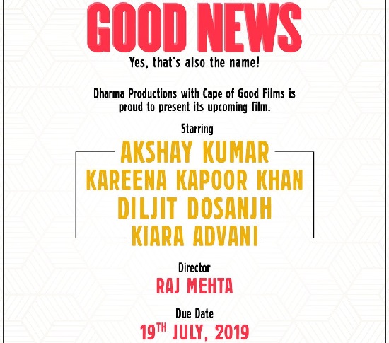 यह ख़बर पहले ही आ गई थी कि वापसी के बाद करीना दूसरी फिल्म के लिए भी तैयार हैं। करीना कपूर अब करण जौहर के बैनर पर बनने वाली फिल्म का हिस्सा होंगी। बाद में इसमें अक्षय कुमार भी जुड़ गए। फिल्म में वो करीना कपूर के पति का रोल निभाएंगे। शादी के बाद ये कपल सरोगेसी के जरिये एक बच्चा चाहते हैं। ये मज़ेदार कहानी एक सच्ची घटना पर आधारित है। फिल्म के एक और जोड़ी भी नज़र आएगी। इसके लिए अब तक कार्तिक आर्यन से लेकर जाह्नवी कपूर तक कई नाम आये लेकिन बताया जाता कि दिलजीत दोसांझ और कियारा आडवाणी को फ़ाइनल किया गया है। करीना और अक्षय के घर बच्चे के आने की गुड न्यूज़ के चलते ही इस फिल्म को नाम रखा गया है। फिल्म इस साल दिसंबर में फ्लोर पर जायेगी और 19 जुलाई 2019 को रिलीज़ की जायेगी l