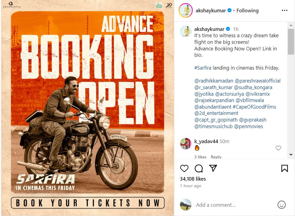 अक्षय कुमार ने फैंस के लिए बुधवार को इंस्टाग्राम पर एक पोस्ट शेयर किया है, जिसमें बताया है कि 'सरफिरा' एडवांस बुकिंग के लिए तैयार है। उन्होंने एक पोस्टर भी साझा किया है, जिसमें वो बाइक चलाते नजर आ रहे हैं। इसके साथ कैप्शन लिखा है, 'अब समय आ गया है कि बड़े पर्दे पर एक क्रेजी सपने को उड़ान भरते हुए देखा जाए। एडवांस बुकिंग शुरू हो चुकी है'।