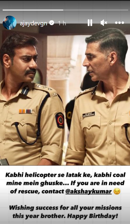 'सुहाग', 'खाकी' और 'सूर्यवंशी' जैसी कई फिल्मों में साथ काम कर चुके एक्टर अजय देवगन ने अक्षय कुमार को उनके बर्थडे पर विश करते हुए एक इंस्टाग्राम स्टोरी शेयर की है। इस पोस्ट में उन्होंने 'सूर्यवंशी' फिल्म की एक तस्वीर शेयर की है। इसके साथ ही उन्होंने लिखा 'कभी हेलीकॉप्टर से लटके, कभी कोयला खदान में घुसे। अगर आपको बचाव की जरूरत है तो अक्षय कुमार से संपर्क करें। भाई, इस साल आपके सभी मिशनों की सफलता की कामना करता हूं। जन्मदिन की शुभकामनाएं।