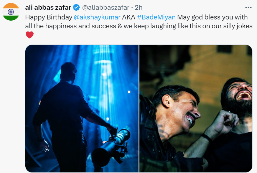 'बड़े मियां छोटे मियां' के निर्देशक अली अब्बास जफर ने इस खास दिन पर अभिनेता को शुभकामनाएं देने के लिए ट्विटर का सहारा लिया। फिल्म निर्माता ने 'बड़े मियां' की शानदार तस्वीरें शेयर कीं और उन्हें शुभकामनाएं देते हुए कहा, 'भगवान आपको सारी खुशियां और सफलता दे और हम अपने मूर्खतापूर्ण चुटकुलों पर इसी तरह हंसते रहें'।