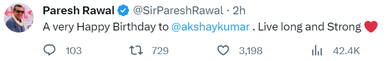 'हेरा फेरी' के को-स्टार परेश रावल ने अक्षय कुमार को ट्विटर पर ट्वीट कर उन्हें जन्मदिन की बधाई दी है। परेश रावल ने लिखा 'जन्मदिन की शुभकामनाएं अक्षय कुमार। लिव लॉन्ग एंड स्ट्रांग।