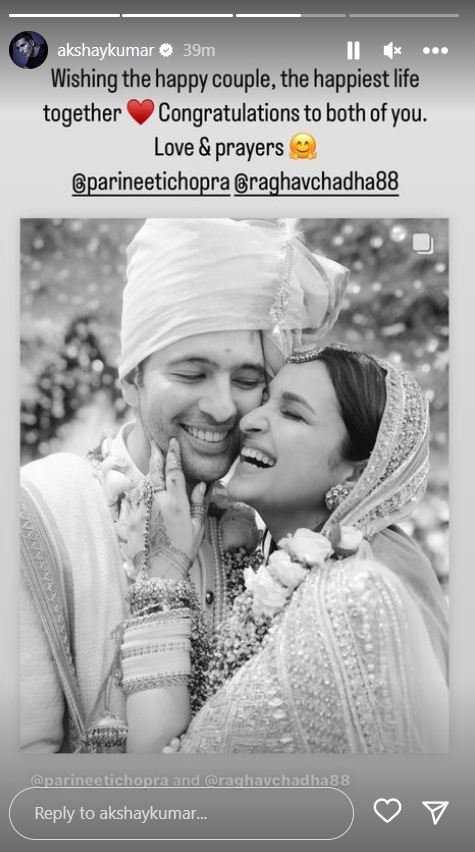 अक्षय कुमार ने अपनी इंस्टाग्राम स्टोरी पर परिणीति चोपड़ा और राघव चड्ढा की शादी की एक तस्वीर शेयर की है, जिसमें दोनों एक-दूसरे को हग करते दिखाई दे रहे हैं। इसी के साथ उन्होंने कैप्शन में लिखा, इस कपल को सुखी जीवन की शुभकामनाएं। आप दोनों को प्यार और दुआओं की बधाई।