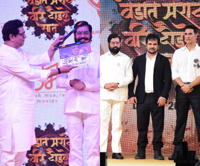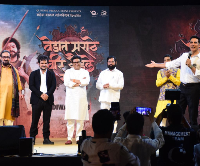 नई दिल्ली, जेएनएन। Akshay Kumar Marathi Film Debut: एक साल में चार-चार बॉलीवुड फिल्में करने वाले अक्षय कुमार ने स्क्रीन पर अब तक कई यादगार किरदार निभाए हैं। उन्होंने कभी अपनी कॉमेडी से थिएटर में बैठी ऑडियंस को हंसाया, तो कभी अपने एक्शन और स्टंट्स से हर किसी को हैरान कर दिया। हिंदी फिल्मों के बाद अब अक्षय कुमार मराठी फिल्मों में कदम रखने जा रहे हैं। बॉलीवुड के खिलाड़ी अक्षय एक्टर और निर्देशक महेश मांजरेकर की ऐतिहासिक फिल्म 'वेडात मराठे वीर दौडले सात' के साथ मराठी फिल्मों में डेब्यू कर रहे हैं। अक्की इस मराठी फिल्म में पहली बार छत्रपति शिवाजी महाराज की भूमिका निभाते हुए नजर आएंगे। हाल ही में फिल्म से जुड़ा एक खास इवेंट हुआ, जहां राजनेता राज ठाकरे से लेकर महाराष्ट्र के मुख्य मंत्री एक नाथ शिंदे तक खास मेहमान बने।