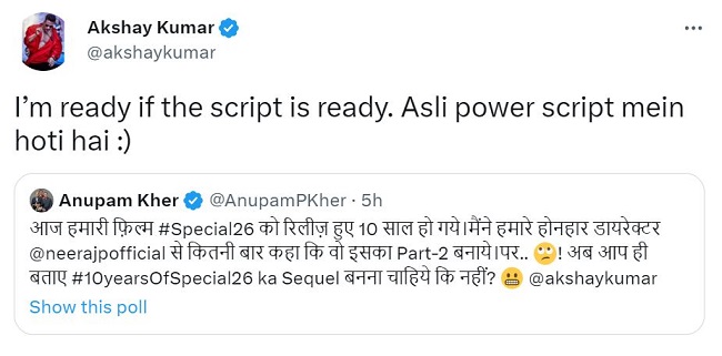 अनुपम खेर ने हिंदी में ट्वीट करते हुए लिखा है, 'आज हमारी फिल्म स्पेशल 26 को रिलीज हुए 10 साल हो गए। मैंने हमारे होनहार डायरेक्टर नीरज पांडे से कितनी बार कहा कि वह इसका दूसरा भाग बनाएं पर अब आप ही बताएं स्पेशल 26 का सीक्वल बनना चाहिए कि नहीं?' इस पर अक्षय कुमार ने ट्वीट करते हुए लिखा है, 'मैं तैयार हूं अगर स्क्रिप्ट तैयार है तो असली पावर स्क्रिप्ट में होती है।' दरअसल उन्होंने फिल्म का एक डायलॉग भी लिखा किया है। इसमें कहा गया है, 'असली पावर दिल में होती है।'