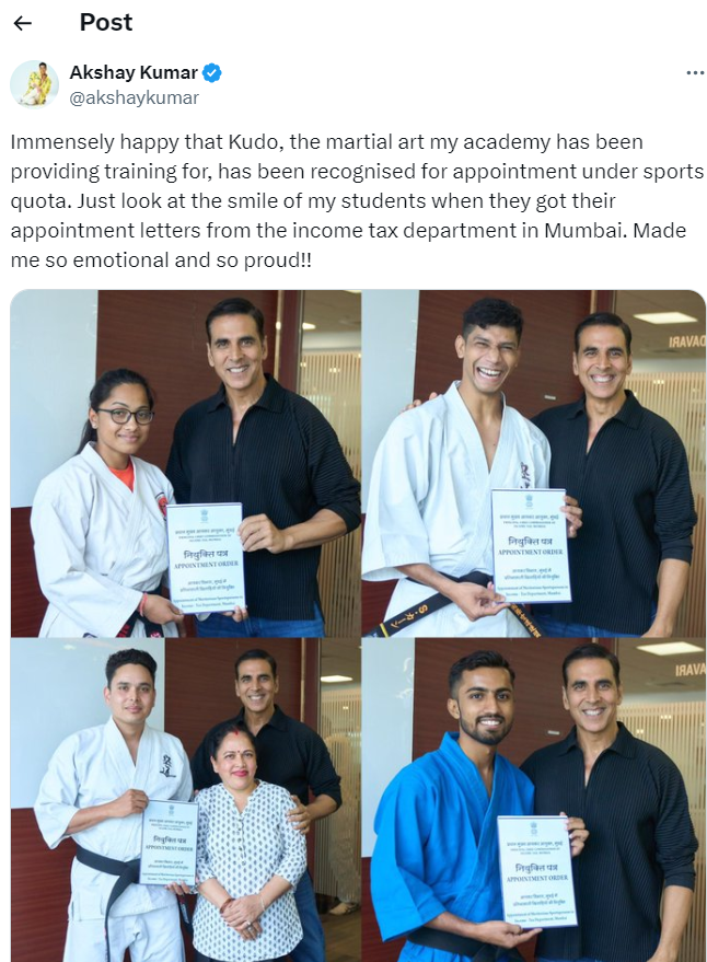 Akshay Kumar की एकेडमी से कुडो की ट्रेनिंग लेने वालों की लगी सरकारी नौकरी, पोस्ट साझा कर इमोशनल हुए अभिनेता