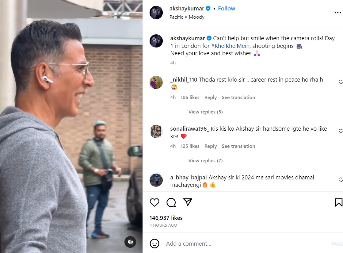 फैंस के चहेते खिलाड़ी कुमार ने लंदन में फिल्म 'खेल खेल में' की शूटिंग शुरू करने की जानकारी शेयर की है। उन्होंने एक वीडियो शेयर किया, जो खूब वायरल हो रहा है। वीडियो में अक्षय ग्रे हुडी और स्पेक्स लगाए नजर आ रहे हैं। उनके चेहरे पर बड़ी सी स्माइल है।