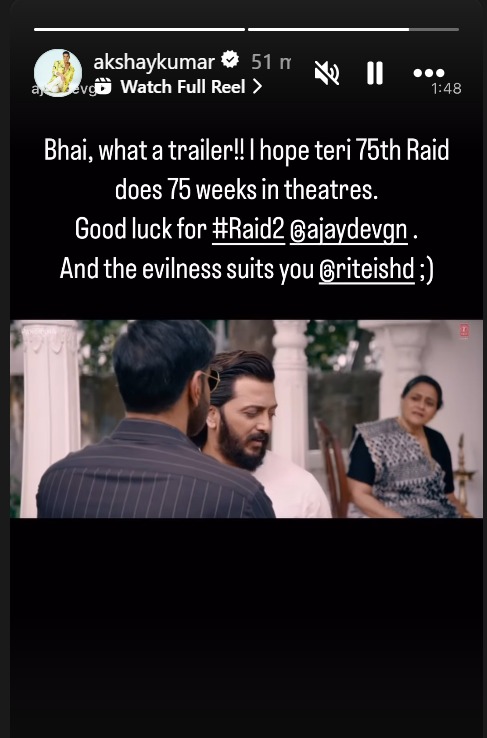 वहीं अब एक्टर के सबसे अजीज दोस्त अक्षय कुमार ने भी अजय देवगन को उनकी फिल्म के लिए बधाई दी है। इंस्टा स्टोरी पर फिल्म का ट्रेलर शेयर करते हुए अक्षय ने लिखा- भाई! क्या ट्रेलर था। मैं दुआ करता हूं कि 75वीं रेड थिएटर्स में 75 हफ्ते पूरे करे। #Raid2 के लिए बधाई। वही रितेश देशमुख को टैग करते हुए खिलाड़ी कुमार ने लिखा- 'तुम पर खलनायक का रोल जमता है।'