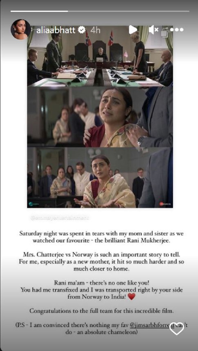 आलिया भट्ट ने पोस्ट पर लिखा है, 'शनिवार की रात मेरे, मेरी बहन और मां के साथ आंसू बहे। हमने हमारी पसंदीदा और प्रतिभाशाली रानी मुखर्जी की फिल्म मिसेज चटर्जी वर्सेस नॉर्वे देखी। यह मेरे लिए खासकर बहुत ही महत्वपूर्ण कहानी है, जो बताई जानी थी क्योंकि मैं एक नई मां बनी हूं। इसने मुझे द्रवित कर दिया। रानी आपकी तरह कोई नहीं है। मैं आपके साथ जुड़े रही। आपको इस फिल्म के लिए बधाई। वहीं, जिम सर्भ ने भी बहुत अच्छा काम किया है।'