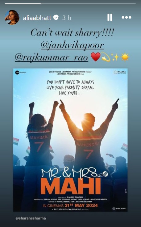 बॉलीवुड एक्ट्रेस आलिया भट्ट ने अपने सोशल मीडिया हैंडल इंस्टाग्राम की स्टोरी पर 'मिस्टर एंड मिसेज माही' का पोस्टर शेयर किया है। इस पोस्टर को एक्ट्रेस ने जाह्नवी और राजकुमार को टैग करते हुए कैप्शन में लिखा कि इंतजार नहीं हो रहा शैरी।