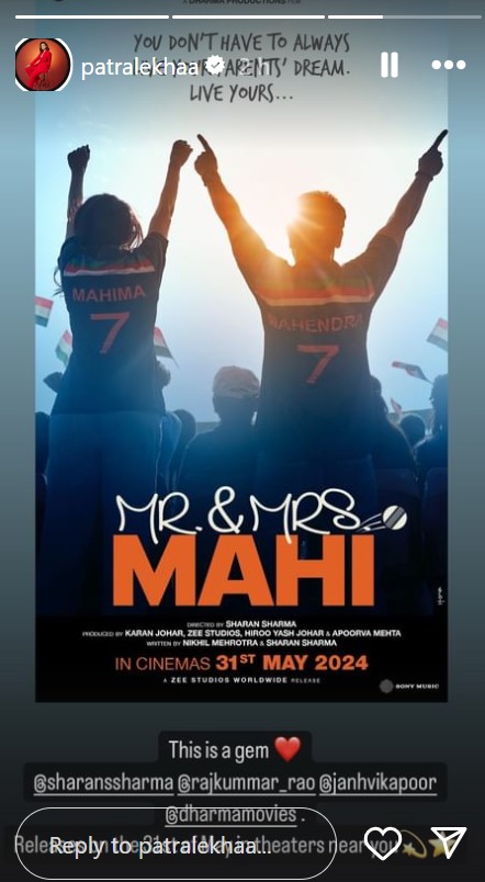 राजकुमार राव की पत्नी और एक्ट्रेस पत्रलेखा ने भी पोस्टर शेयर कर इसकी तारीफ की। उन्होंने अपने कैप्शन में लिखा कि यह एक रत्न है।