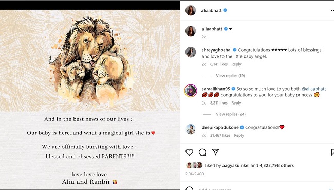 रणबीर कपूर और आलिया भट्ट ने अभी तक अपनी बेटी के नाम का खुलासा नहीं किया है और ना ही उन्होंने कोई तस्वीर शेयर की है। इस बीच आलिया भट्ट ने बेटी होने की खुशी में सोशल मीडिया पर एक पोस्ट किया था। उन्होंने लिखा था, 'हमारे जीवन की सबसे अच्छी खबर, हमारी बेटी दुनिया में आ गई। वह बहुत ही जादुई लड़की है। हमें आशीर्वाद दीजिये कि हम माता-पिता बन गए हैं।'