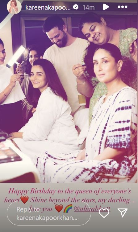 ननद करीना कपूर ने भी आलिया को खास अंदाज में बर्थडे विश किया है। आलिया के साथ मेकअप करवाते हुए एक फोटो शेयर करते हुए करीना ने लिखा, "सभी दिलों की रानी जन्मदिन मुबारक। सितारों से परे चमकें, मेरी डार्लिंग। लव यू।"