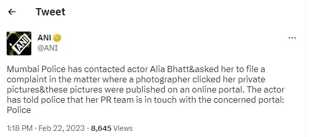 समाचार एजेंसी एएनआई ने अपने ट्वीट में ये बताया कि मुंबई पुलिस ने इस सिलसिले में आलिया भट्ट से कांटेक्ट किया। उन्होंने लिखा, 'इस मामले में मुंबई पुलिस ने आलिया भट्ट उनकी प्राइवेट तस्वीरें लेने वाले फोटोग्राफर और इसे पब्लिश करने वाले ऑनलाइन पोर्टल के खिलाफ शिकायत करने के लिए कहा है।