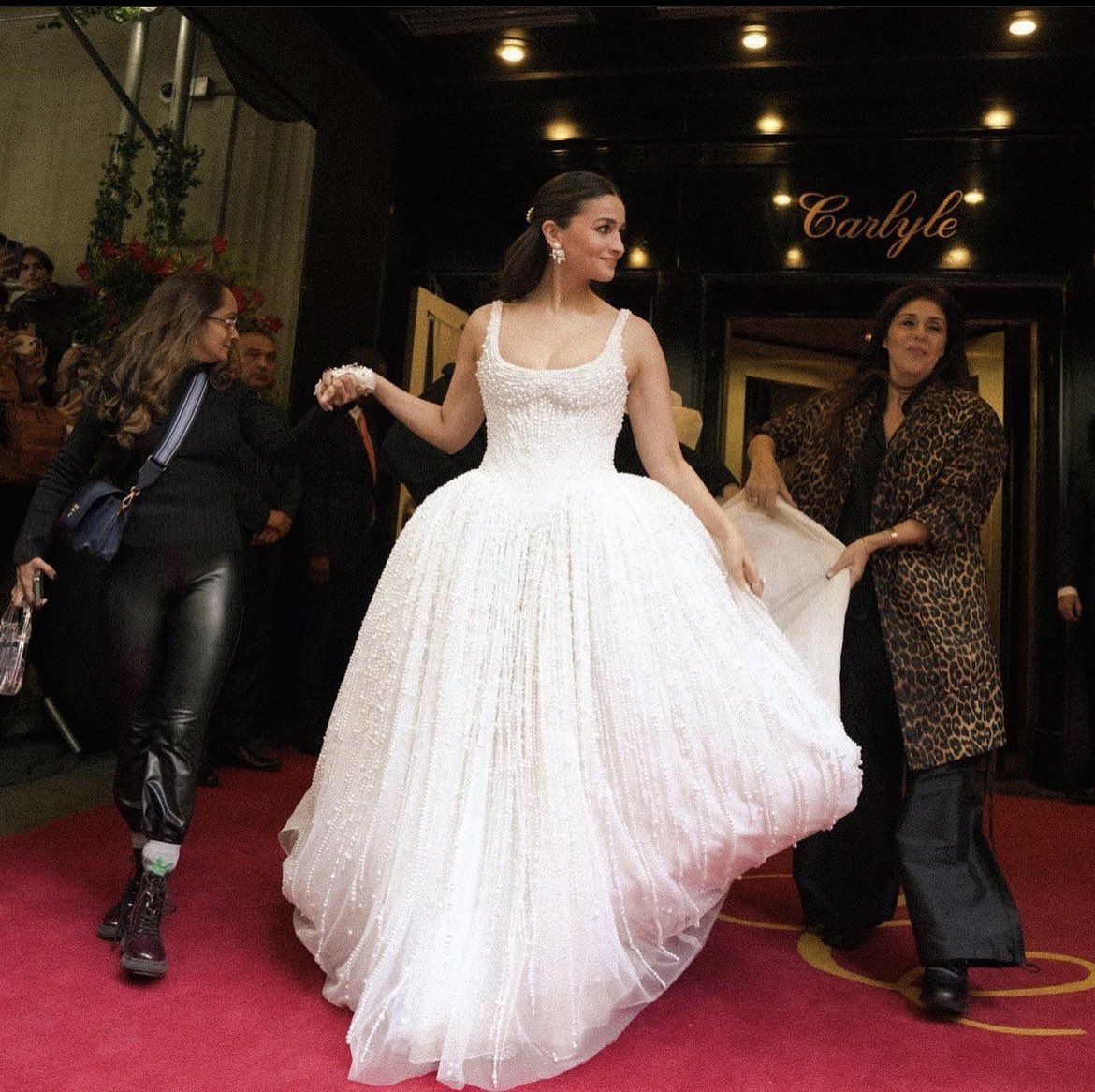 रेड कारपेट पर आलिया ने व्हाइट गाउन में एट्री मारी। इस दौरान एक्ट्रेस बेहद खूबसूरत नजर आई। उन्होंने 'कार्ल लेगरफेल्ड: ए लाइन ऑफ ब्यूटी' की थीम पर व्हाइट कलर का गाउन कैरी किया था। एक्ट्रेस का ये गाउन फेमस डिजाइनर प्रबल गुरुंग ने डिजाइन किया है।