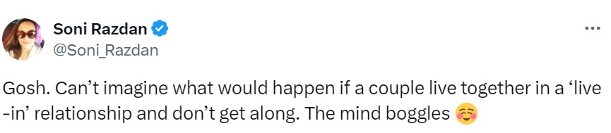 सोनी राजदान सोशल मीडिया पर काफी एक्टिव रहती हैं और वहां वह अपने विचार शेयर करती रहती हैं। अब हाल ही में उन्होंने एक्स हैंडल (ट्विटर) पर मुकेश खन्ना के लिव-इन रिलेशनशिप वाले बयान पर चुटकी लेते हुए लिखा है कि हे भगवान। सोच भी नहीं सकती कि अगर कोई कपल लिव-इन रिलेशनशिप में साथ रहे और साथ न हो तो क्या होगा। दिमाग चकरा जाता है।
