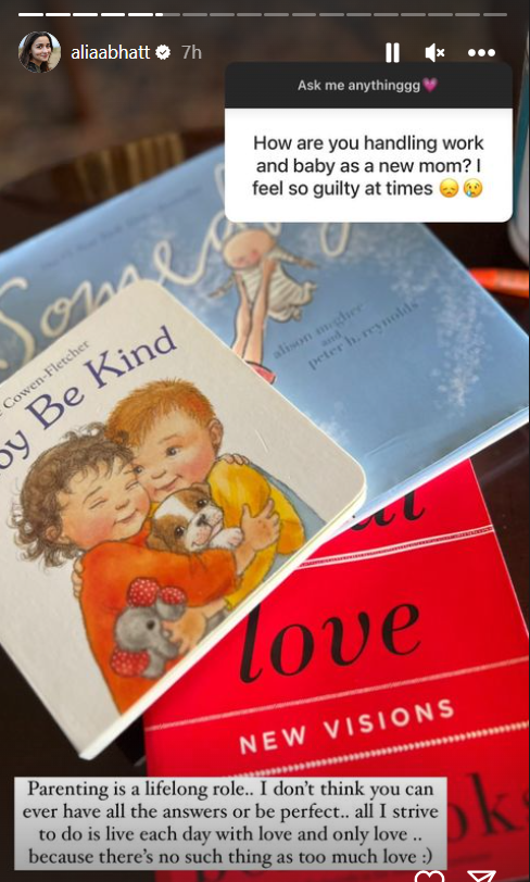 इसके अलावा एक फैन ने उनसे उनकी बेटी राहा को लेकर सवाल किया। उन्होंने पूछा कि काम के साथ-साथ वह राहा का ख्याल कैसे रख रही हैं। इस सवाल पर आलिया ने कहा-'पैरेंटिंग एक लाइफ लॉन्ग रोल है.. मुझे नहीं लगता कि आपके पास कभी भी सभी जवाब हो सकते हैं या आप परफेक्ट हो सकते हैं.. मैं बस हर दिन को प्यार और सिर्फ प्यार के साथ जीने की कोशिश करती हूं.. क्योंकि बहुत सारा प्यार से ज्यादा ऐसी कोई चीज नहीं है।
