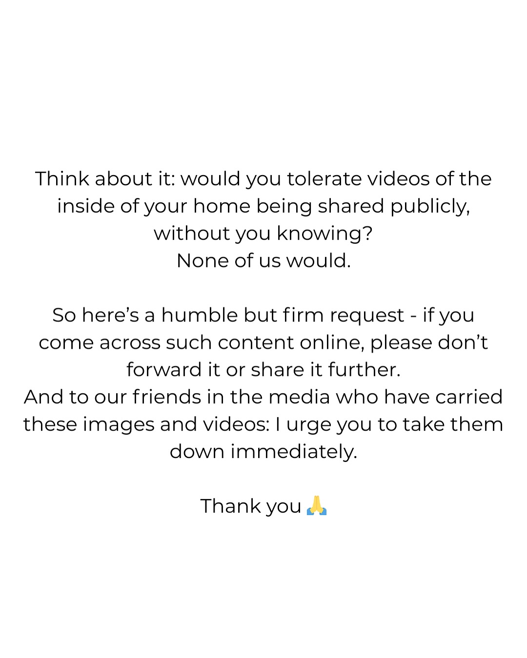 आलिया भट्ट यहीं पर शांत नहीं हुईं, उन्होंने आगे लिखा, "ये कभी भी नॉर्मल नहीं होना चाहिए। इस बारे में जरा सोचिए। क्या आपको बर्दाश्त होगा अगर हम आपके घर के अंदर की वीडियो बनाकर उसे पब्लिक कर दें। बिना आपकी नॉलेज के? हममें से कोई भी ये नहीं चाहेगा। मैं लोगों से ये गुजारिश करना चाहती हूं कि अगर आपको कोई ऐसा कंटेंट दिखता है, तो उसे फॉरवर्ड न करें। मेरे मीडिया के दोस्तों से ये गुजारिश है कि उन्होंने जो भी इमेज या वीडियो बनाई है, उसे तुरंत हटा दें"।