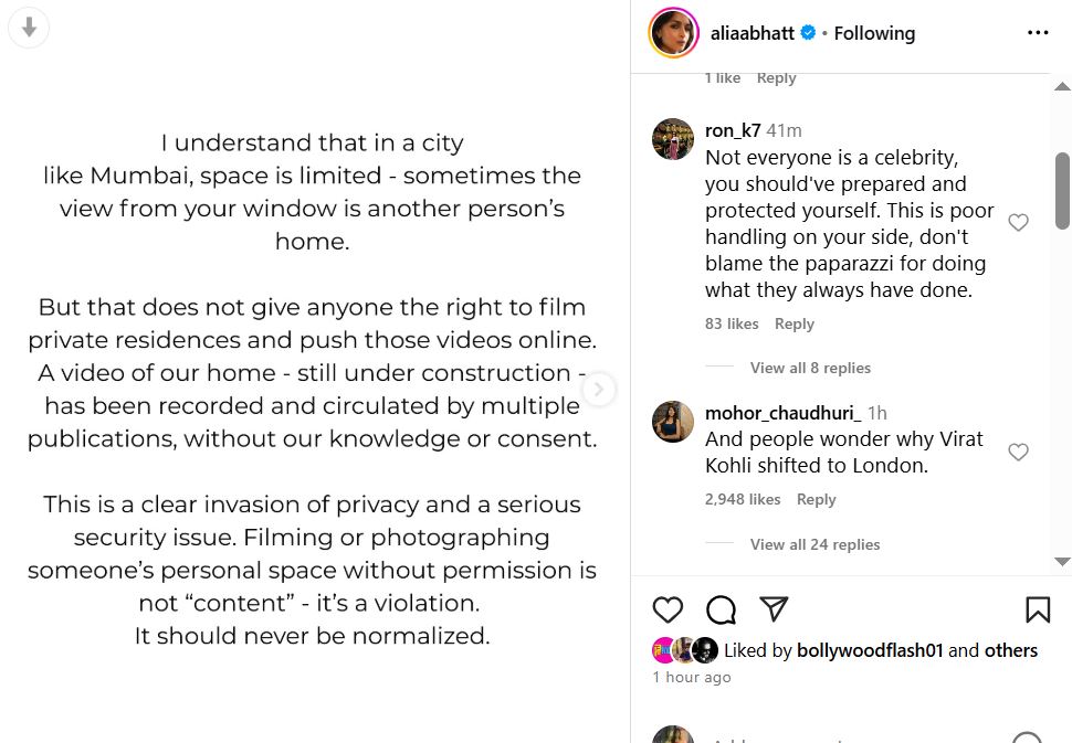 आलिया भट्ट ने अपना गुस्सा व्यक्त करते हुए सोशल मीडिया पर बयान जारी किया और लिखा, "मैं समझती हूं कि मुंबई जैसे शहर में स्पेस लिमिटेड है और कभी कभार लोग एक-दूसरे के घर का खिड़की से व्यू देख सकते हैं, लेकिन ये किसी का भी हक नहीं है कि किसी के प्राइवेट घर का वीडियो बनाओ और उसे ऑनलाइन पोस्ट कर दो"।